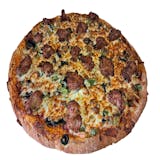 Pepperoni, Sausage, Onion, Green Pepper, Black Olives, Mushroom, and Mozzarella Cheese.